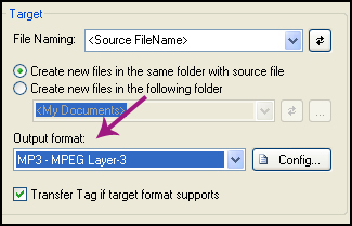 بعد از انتخاب آهنگ از بخش Target ا :Output format را پیدا کنید و فرمت Uotput رو به MP3-MPEG Layer-3 مانند شکل زیر تغییر دهید