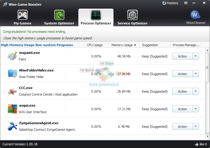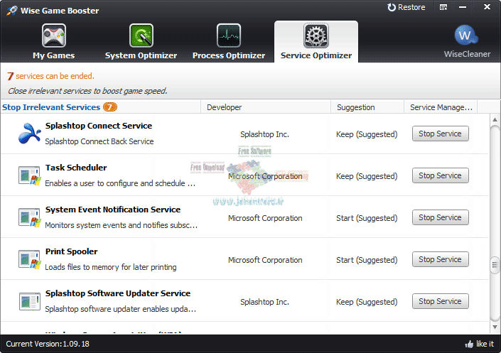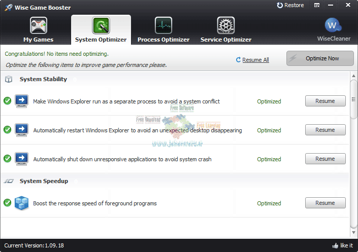 Wise Game Booster 1.23.33 برنامه ای برای افزایش سرعت رایانه جهت اجرای بهتر بازی می باشد. Wise Game Booster قادر است با یک کلیک رایانه شما را برای اجرای بازی بهینه سازی کند و فعالیت های پس زمینه و سرویس های غیر ضروری ویندوز را به سرعت و آسانی ببندد. با دکمه ی Optimize All موجود در این نرم افزار می توانید سرعت اجرای بازی خود را افزایش دهید. شما می توانید بازی خود را در جعبه بازی قرار دهید تا دیگر نیازی به پیدا کردن بازی از آیکون های پیچیده در دسکتاپ نداشته باشید.