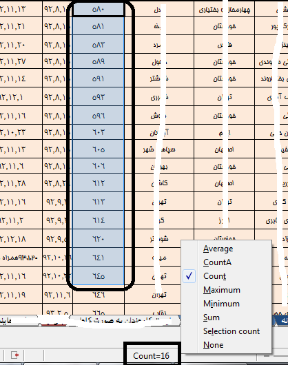 انتخاب چند سلول در اکسل لایبر آفیس و نشان دادن جمع یا تعداد